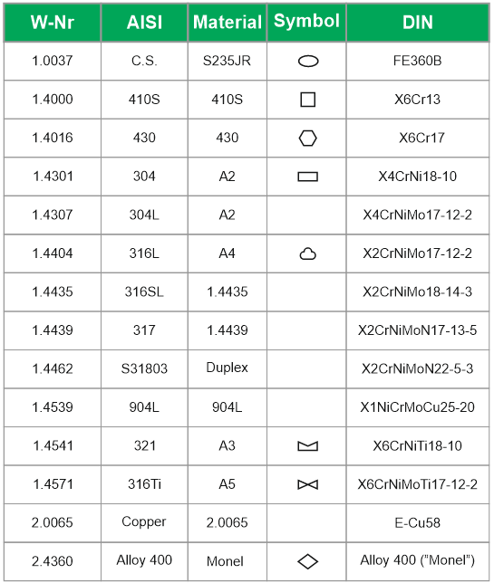 Our Standard materials: 410 – 304L – 316L – 316Ti