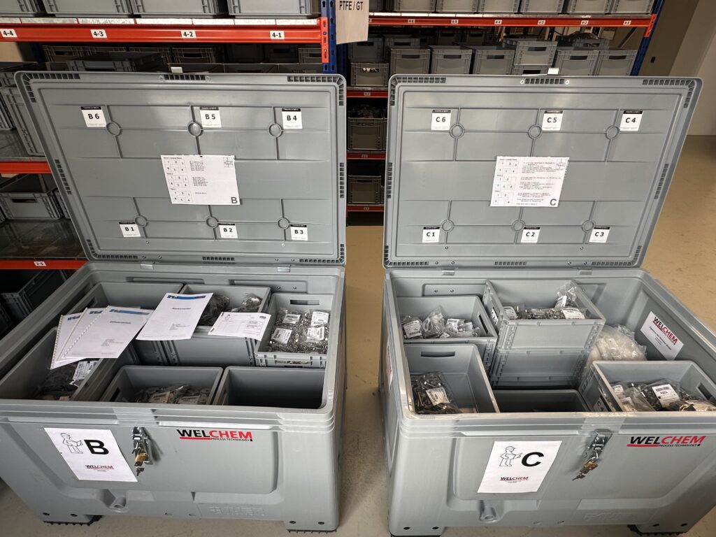 As a consignment stock, we offer various material lockers. The Big Boxes or the Small Container are used for small shutdowns („pit stops“) and are often managed by the customers on their own. Normally, the containers are maintained by our stock administrators during the shutdowns. The administrators advises the installation staff on the use of the right compononents, has access to the installation drawings, provides for any necessary refill of the stock and can organize the short-term production of special components. When the consignment stock is managed by us, the billing is based on delivery/return papers.