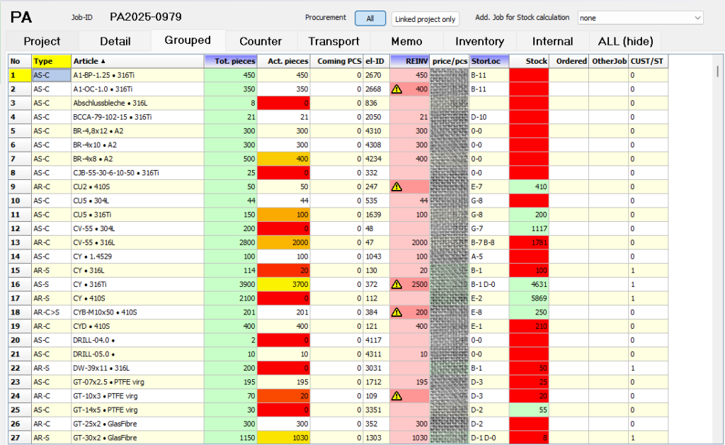 The material excerpt with fixed quotas for the considered plant components then leads to a material list for the assembly of the consignment stock.