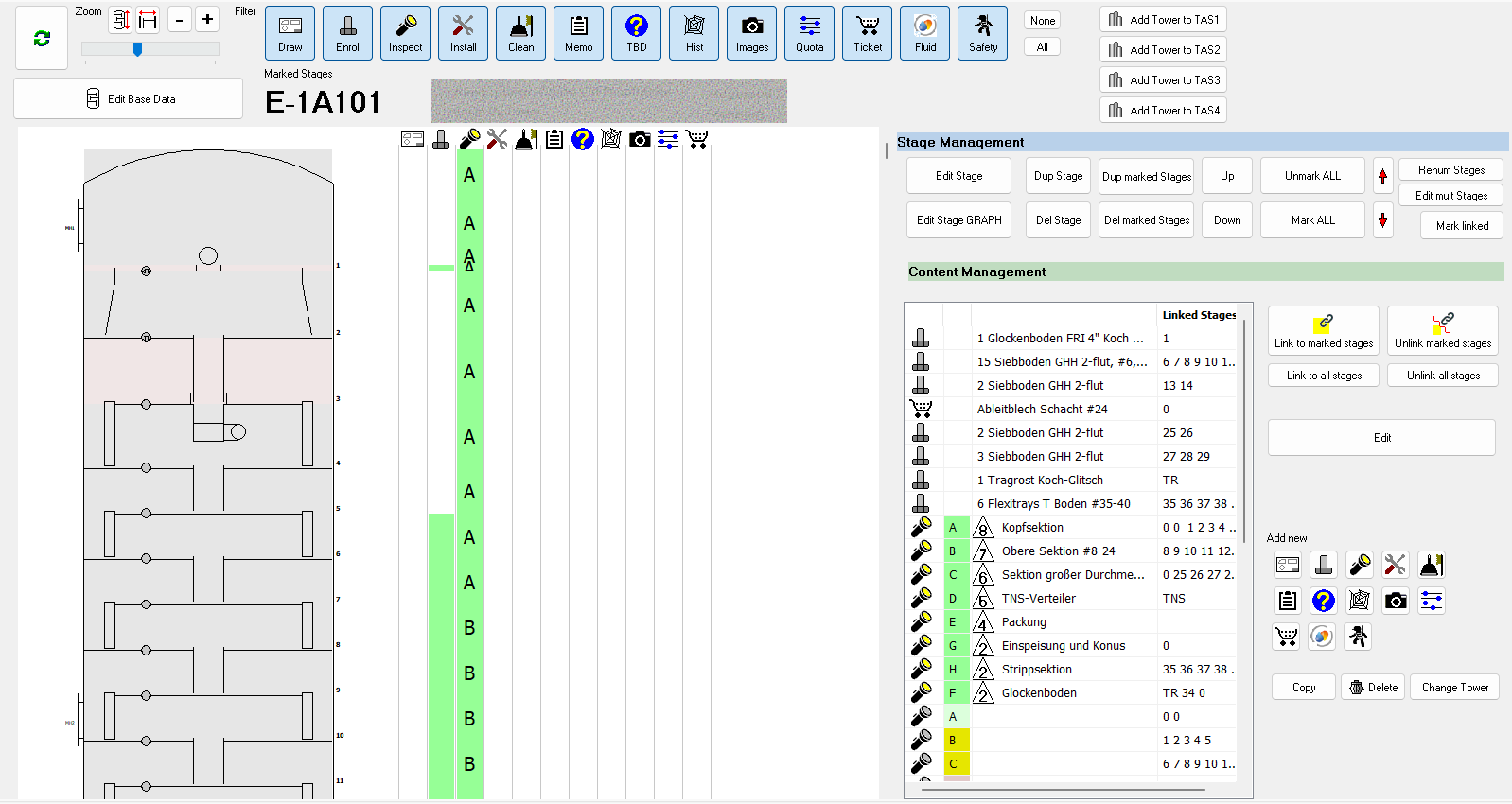 The work usually begins many weeks before the shutdown. Based on the part lists, internals and general arrangement drawings, we analyze all parts and fasteners used. This information is stored in the TowerExplorer tower database and is the basis for the provision of spare parts. Over the past years, we have recorded thousands of towers in the software.